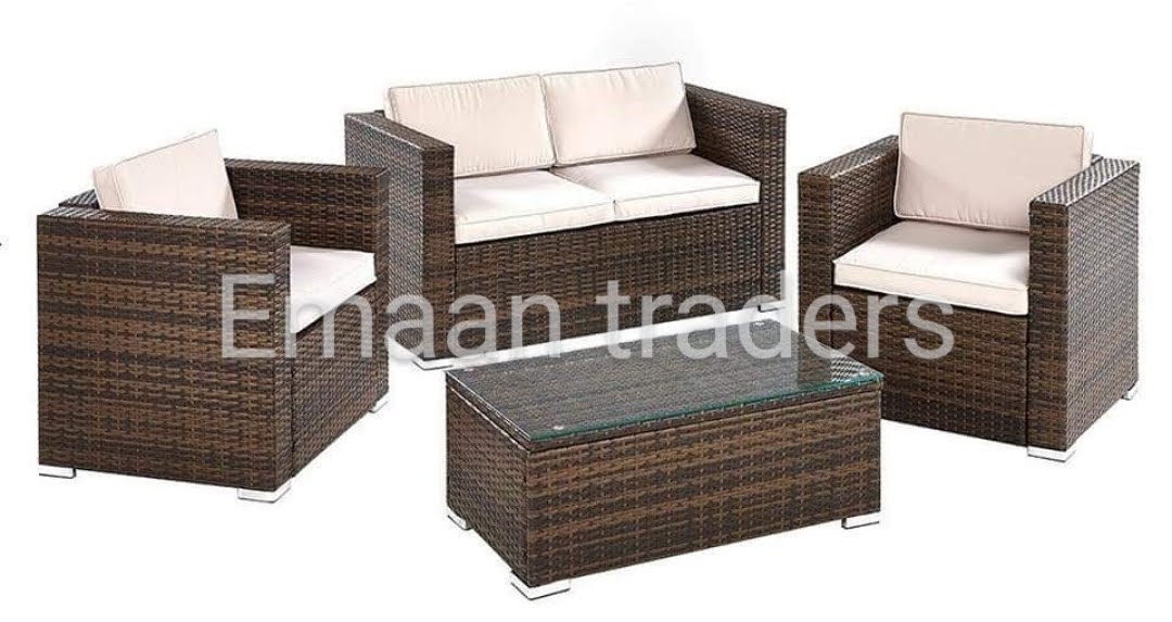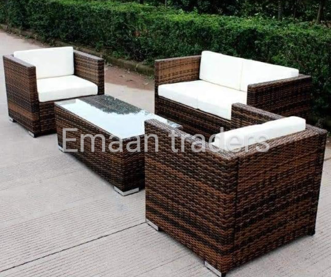 It’s having one two seater and two single seat sofa with stainless steel shoes with premium quality fabric cushions and one table size 24×36″ with 8mm glass.