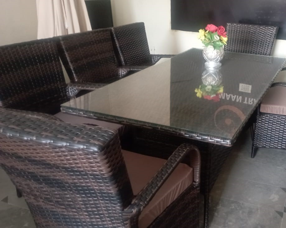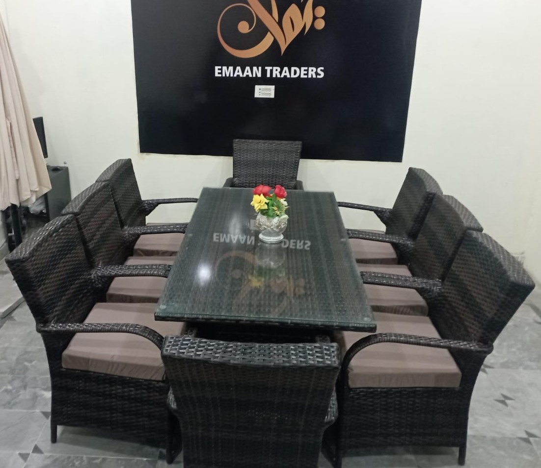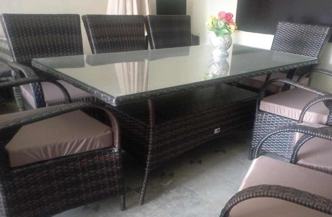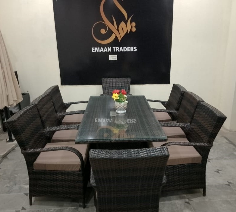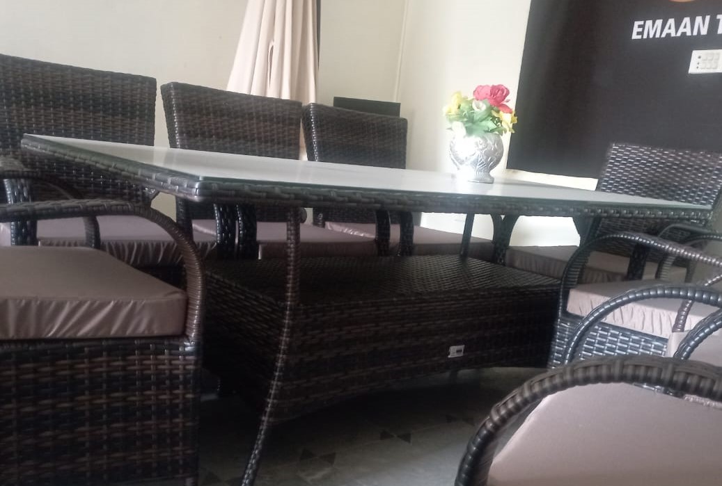 It has 8 relaxing chairs with premium quality parachute fabric cushions with table size 36 × 72″ with 8mm glass.