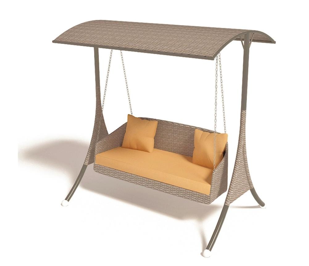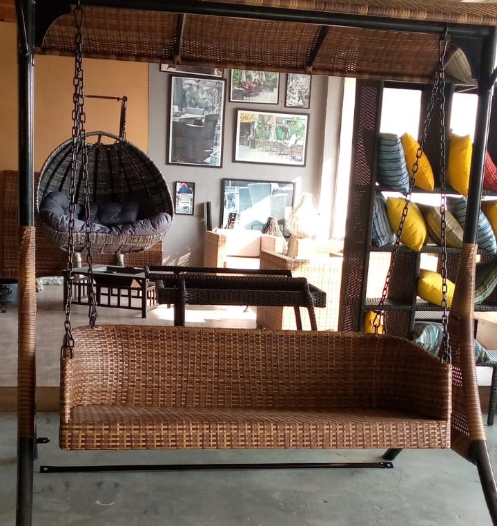 It’s double seater swing in iron powdered coated frames with poliyster fabric cushions.