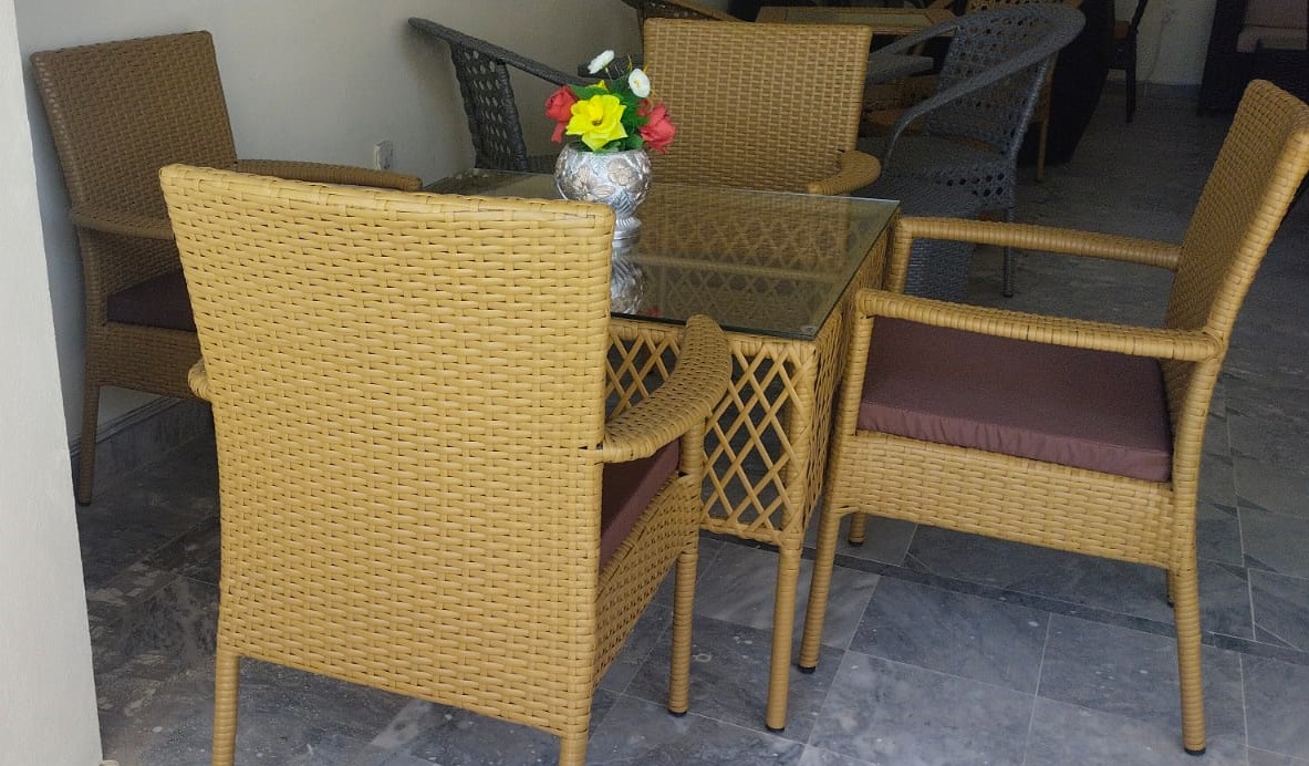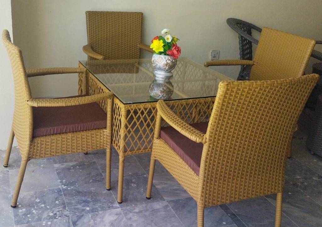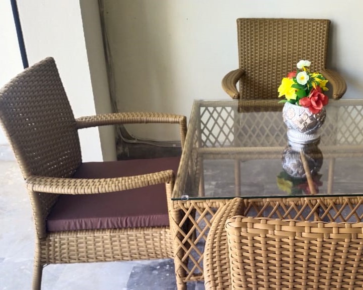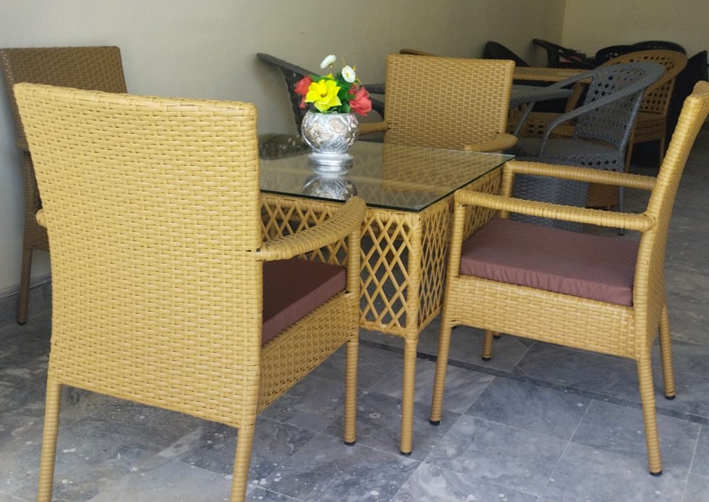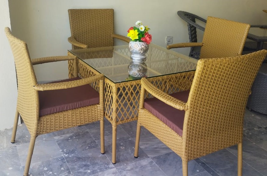It has 4 chairs with premium quality fabric cushions and one square table size 36×36″ with 8mm glass