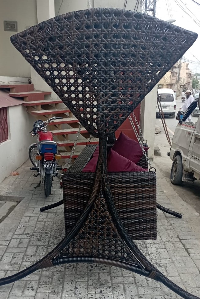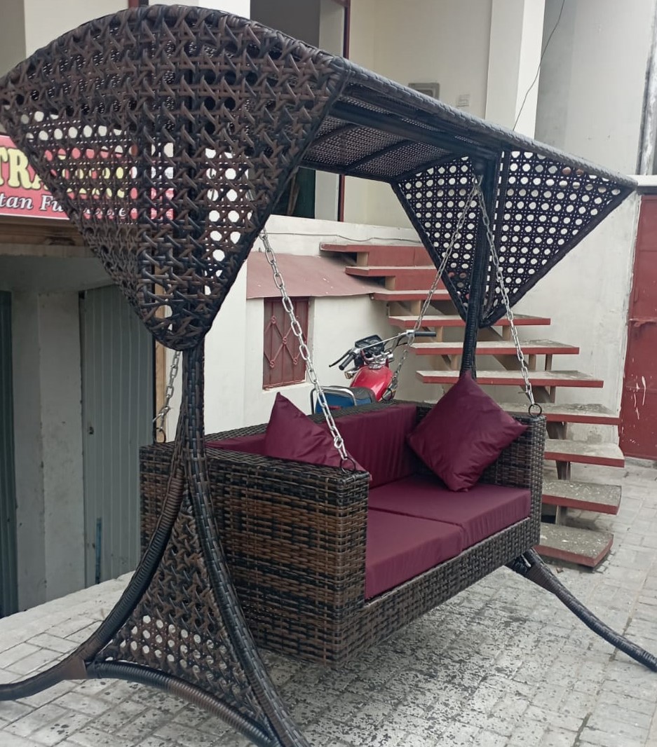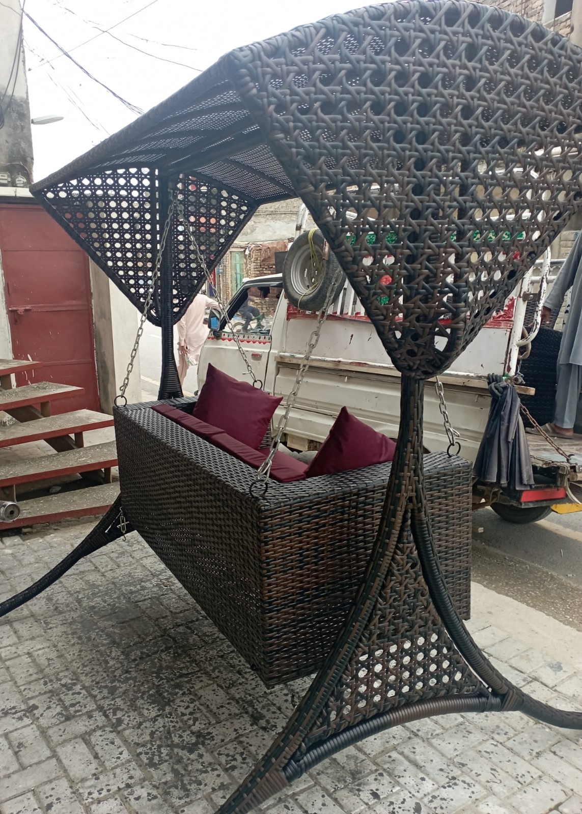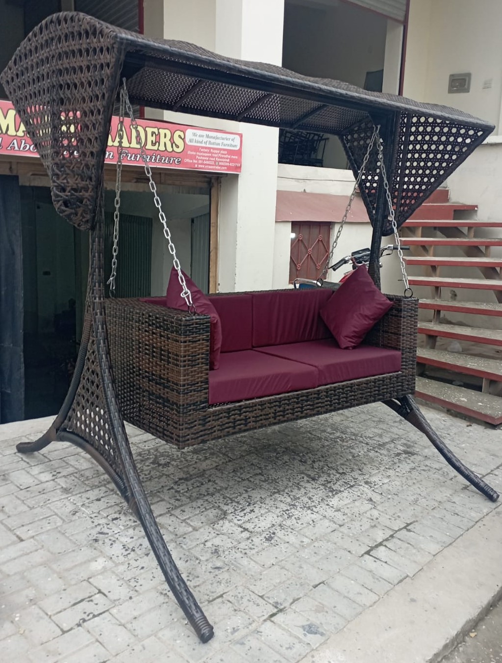 It’s has double seater swing in powdered coated heavy frame with premium quality fabric cushions and pillows.