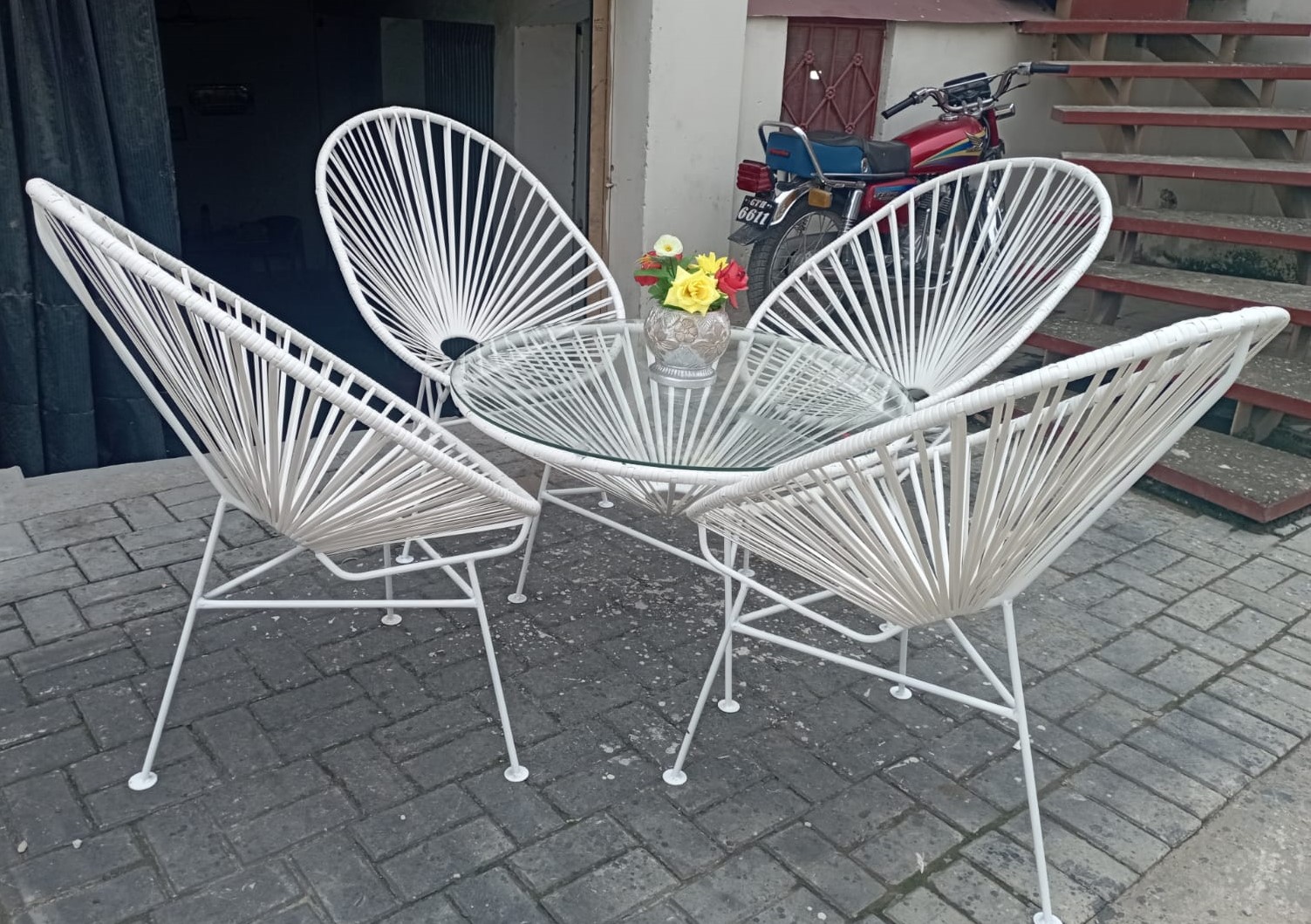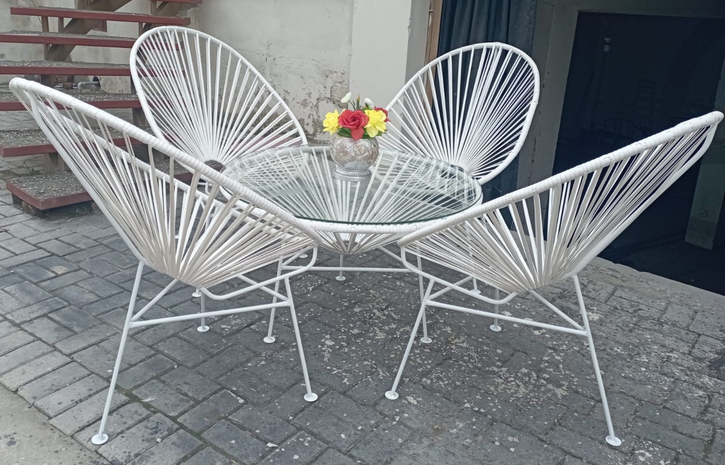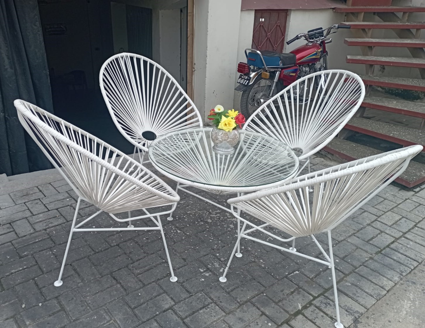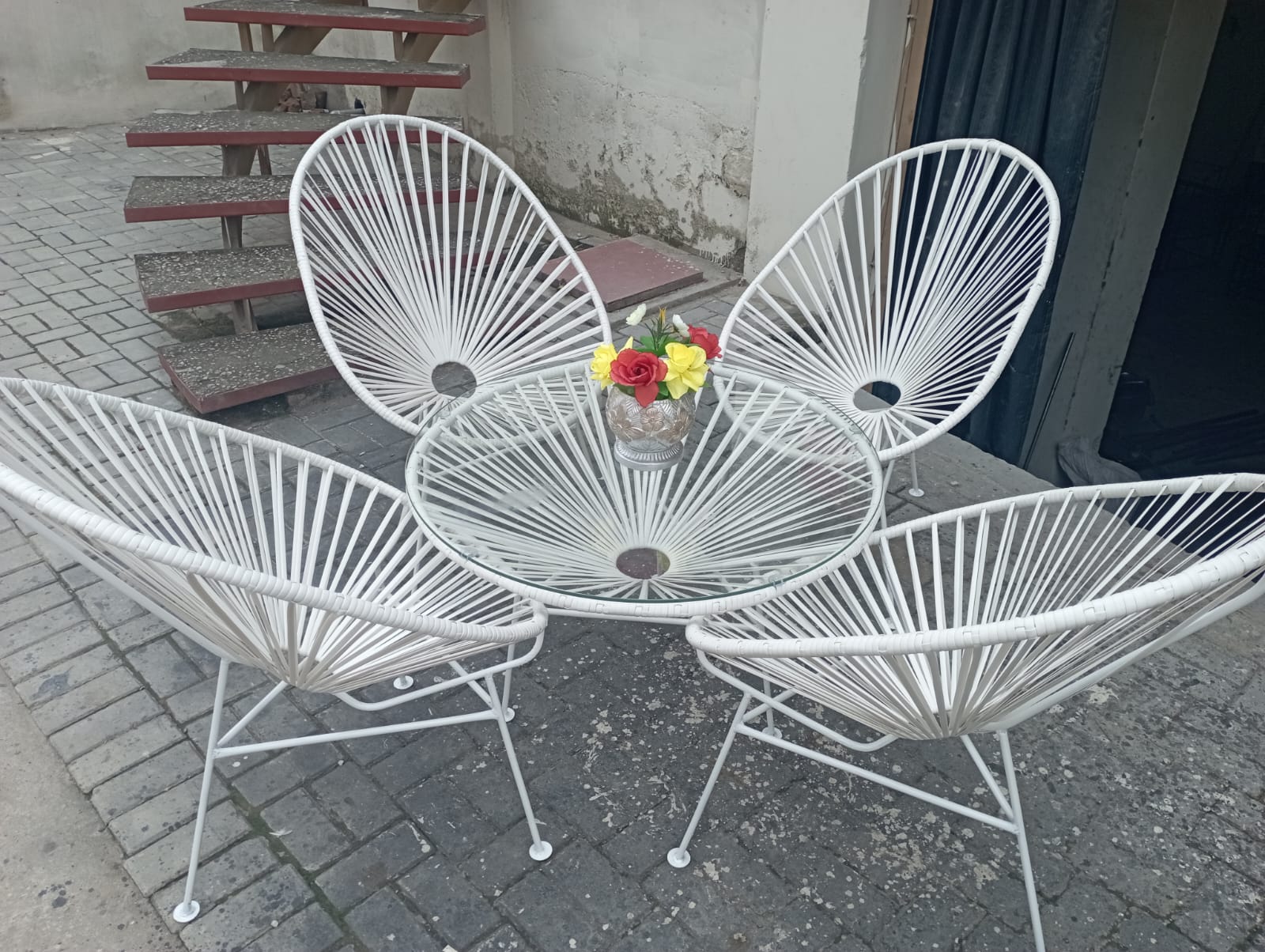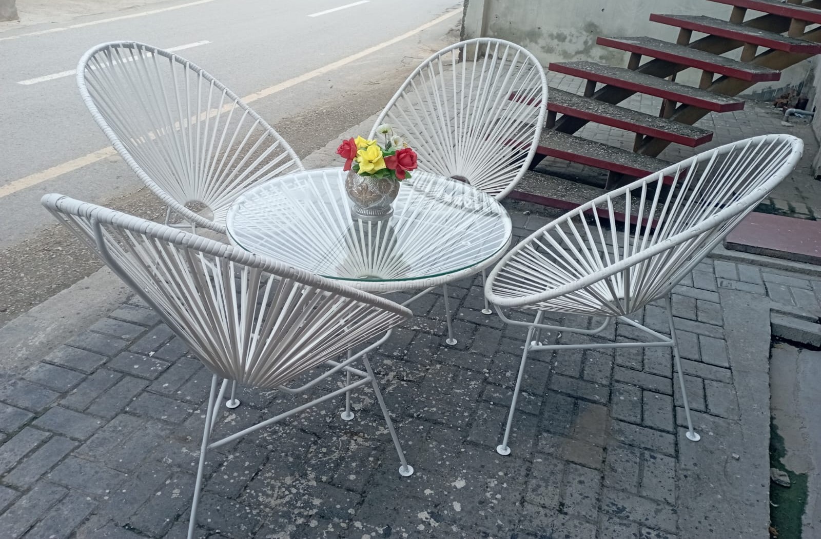 It has 4 chairs with a round table size 30 × 30″ with 8mm glass in powdered coated frames.