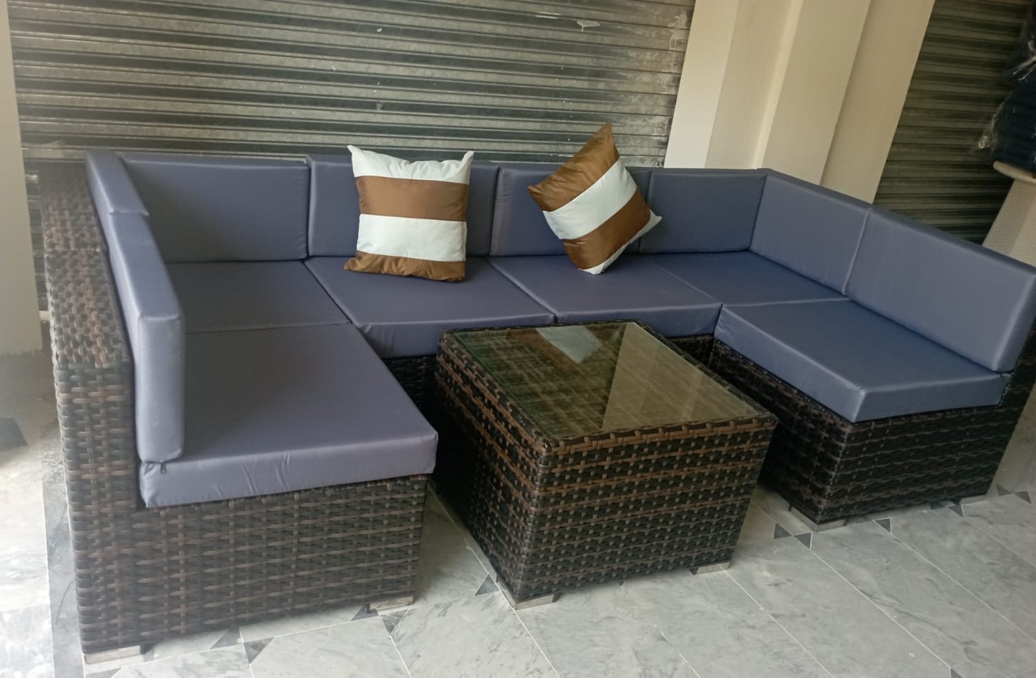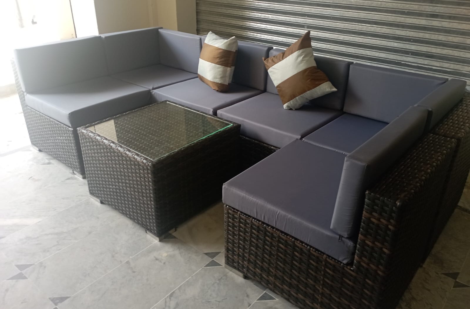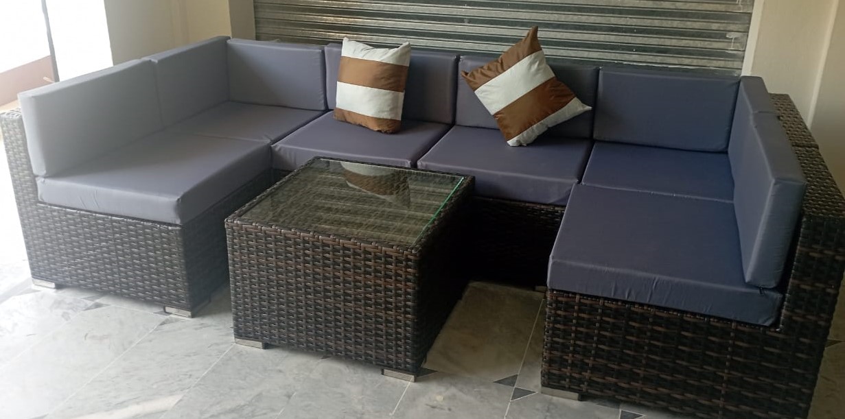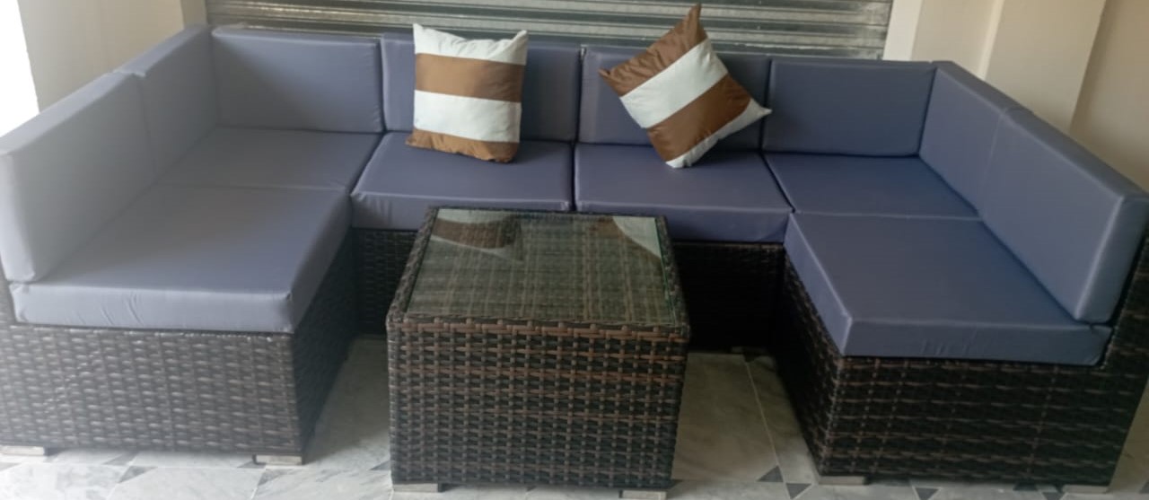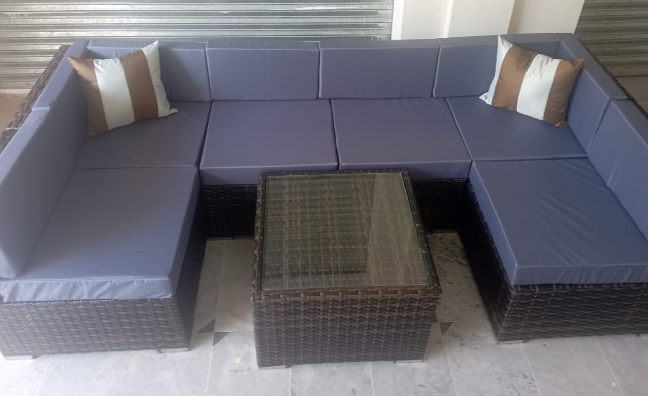 It totally counts 6 seater U shaped sofa with premium quality fabric cushions and pillows with one table size 24 × 24″ with 8mm glass.