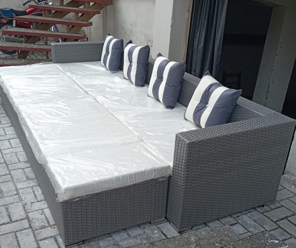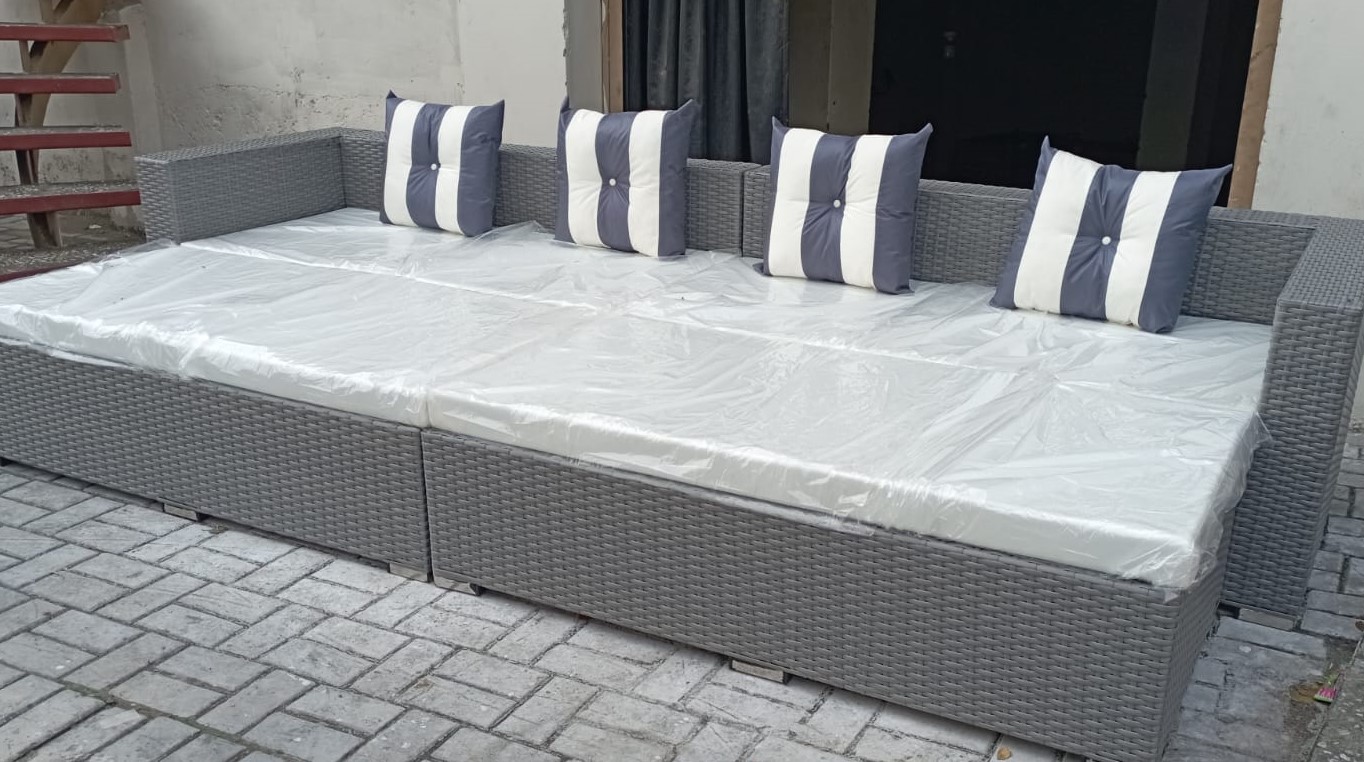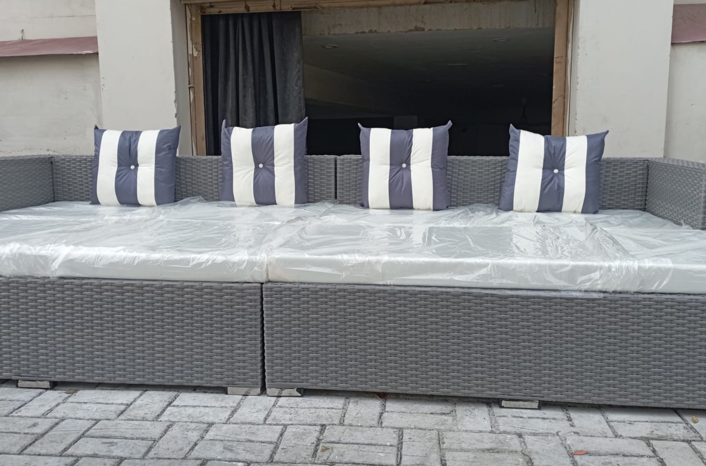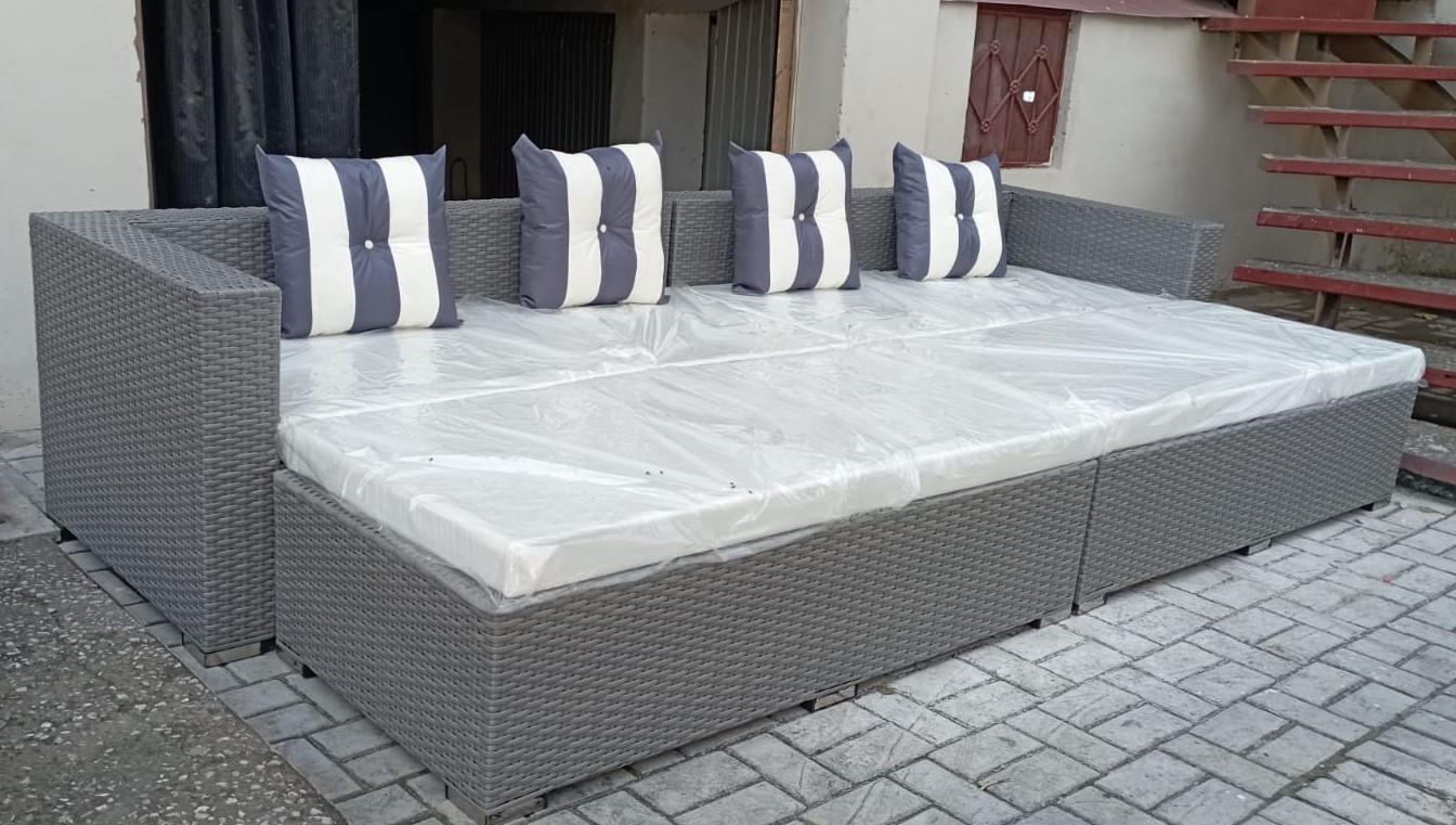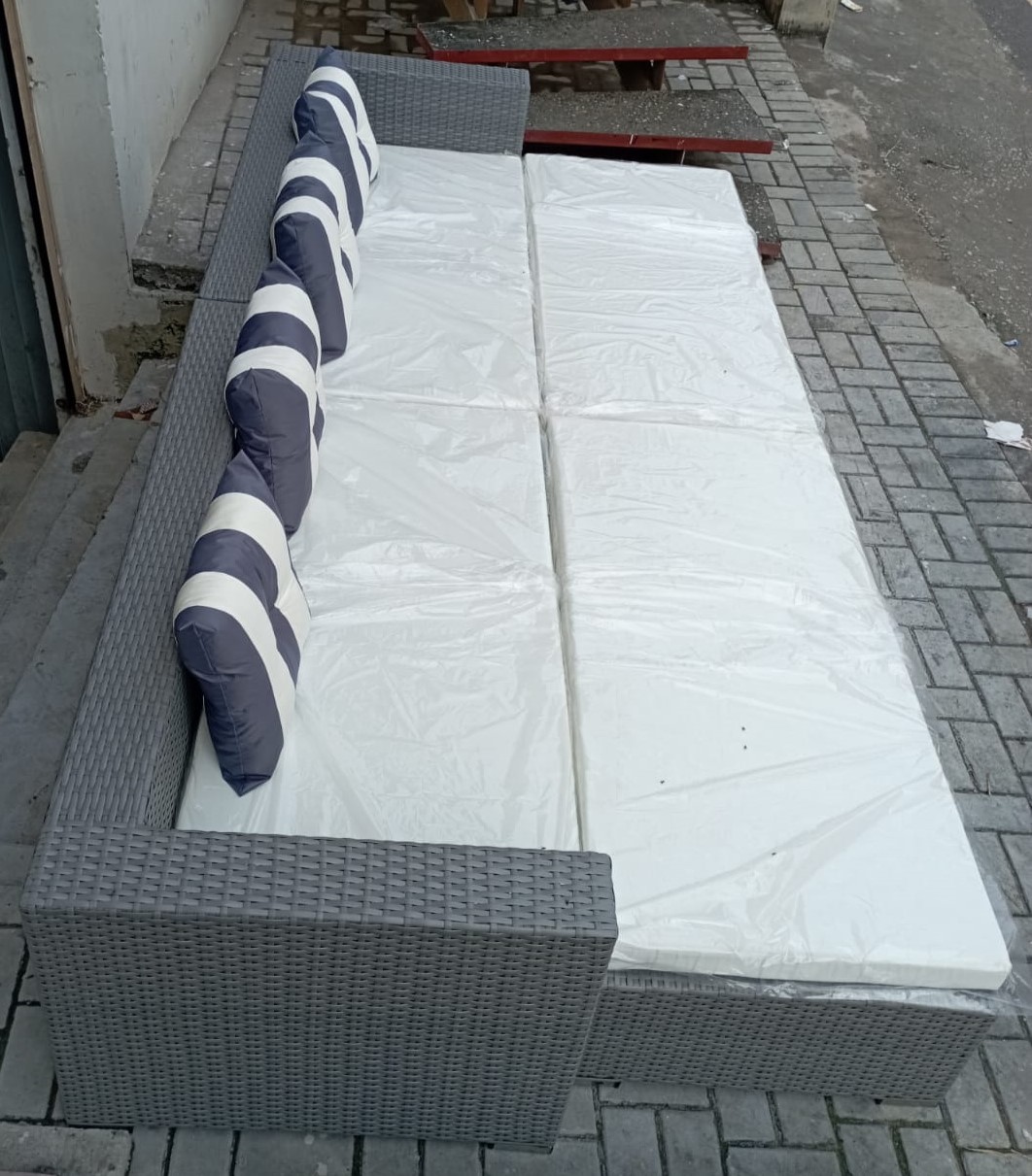 Its sofa with ottomans size is 120″ length and the total width of the sofa 31″ ottoman size is 26 × 55″ each . It’s totally in 4pcs with stainless steel shoes with premium quality fabric cushions and pillows.