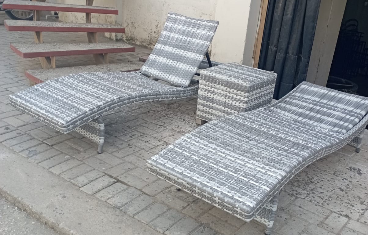 It 2 pcs set swimming pool bed with premium quality fabric cushions and one table size 18×18″ with 8mm glass.