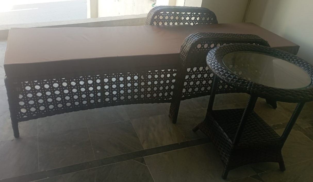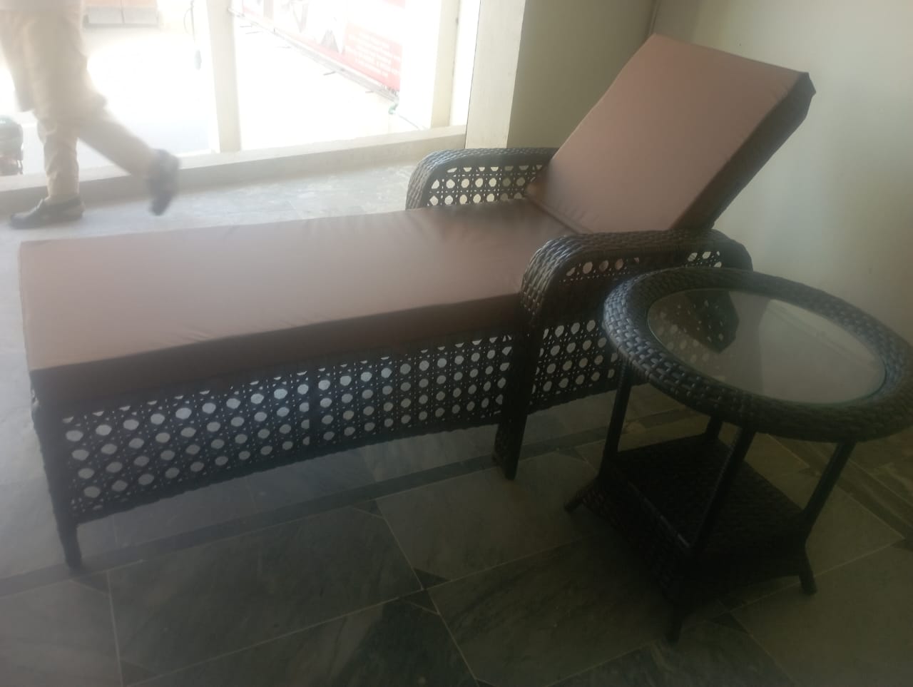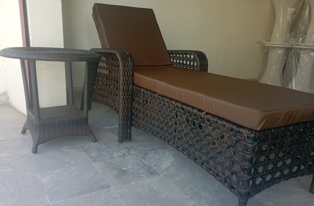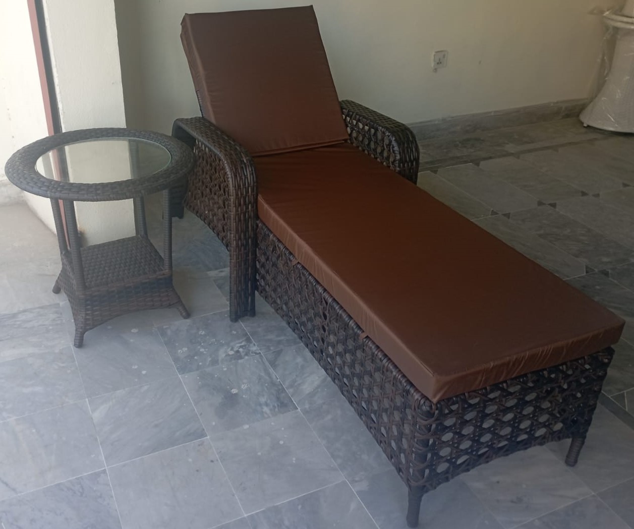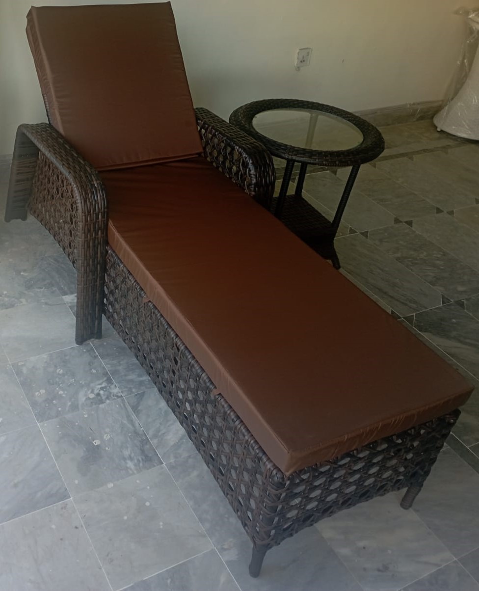 Its lounger ( swimming pool bed) movable headrest size is 30 × 78″ with premium quality fabric cushions and one round style table size 24 × 24″ with inside 8mm glass.