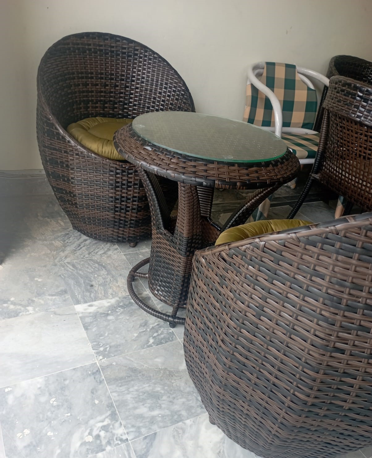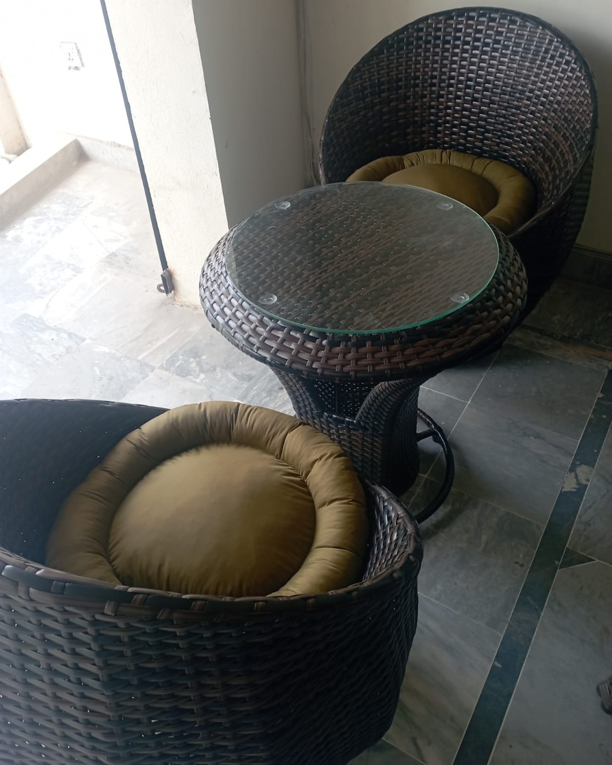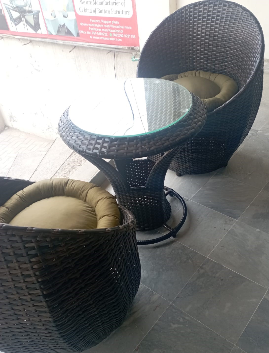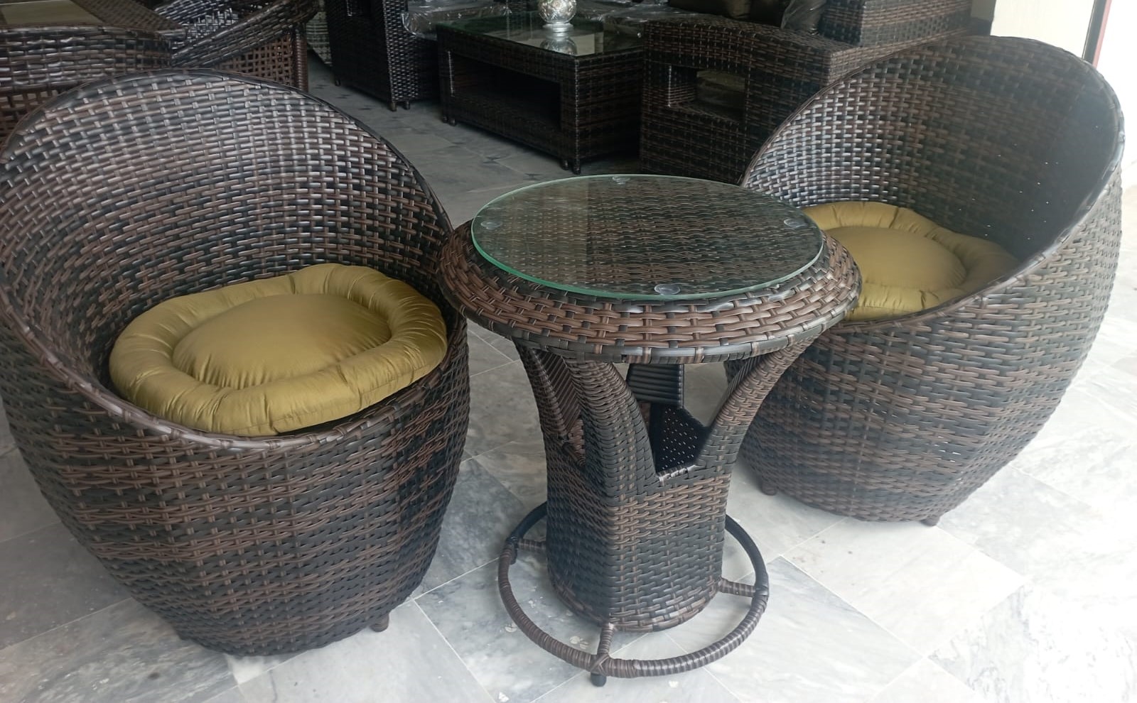 It’s has 2 round style chairs with premium quality parachute fabric cushions and one round style table size 24×24″ with 8mm glass.