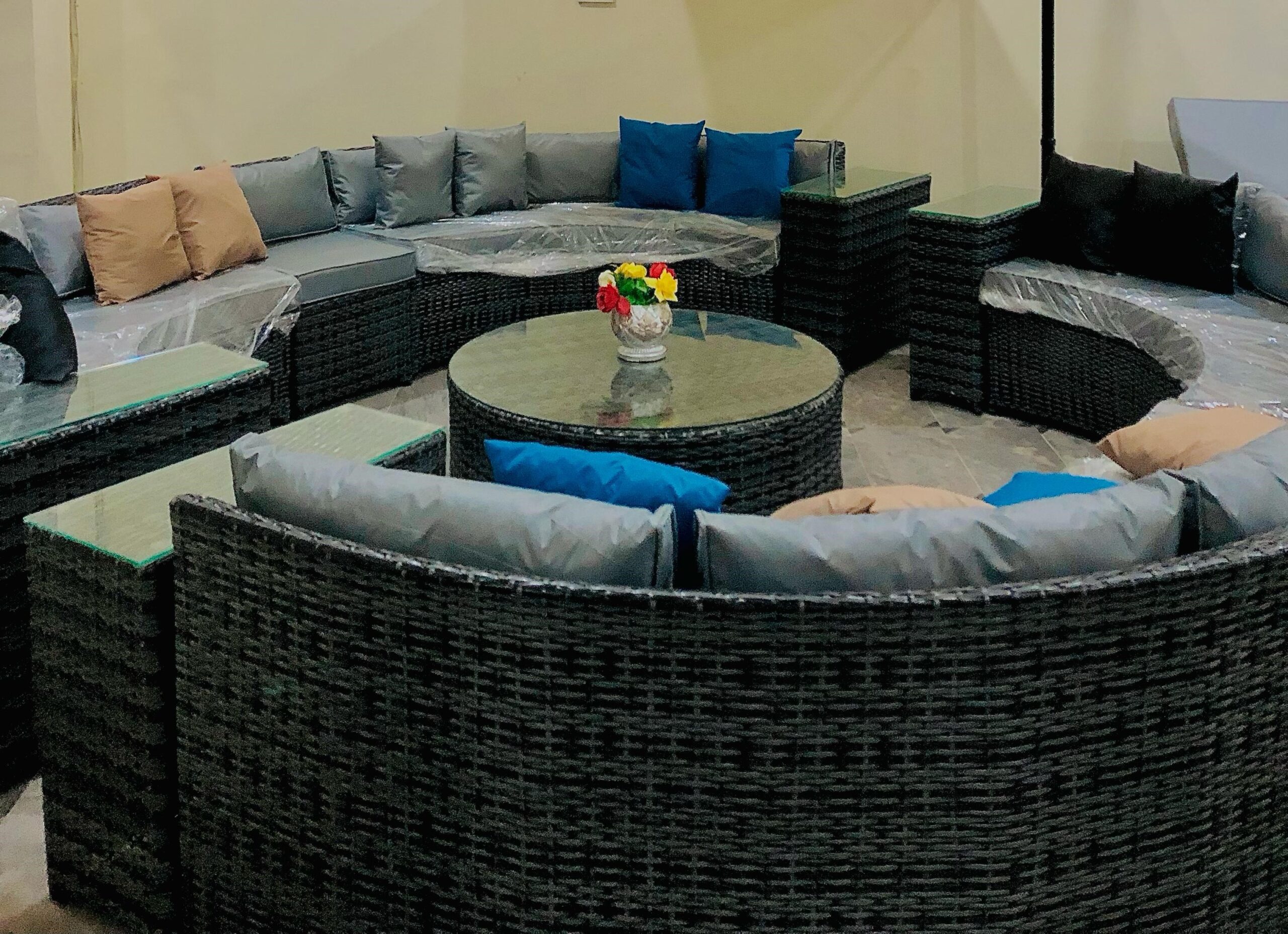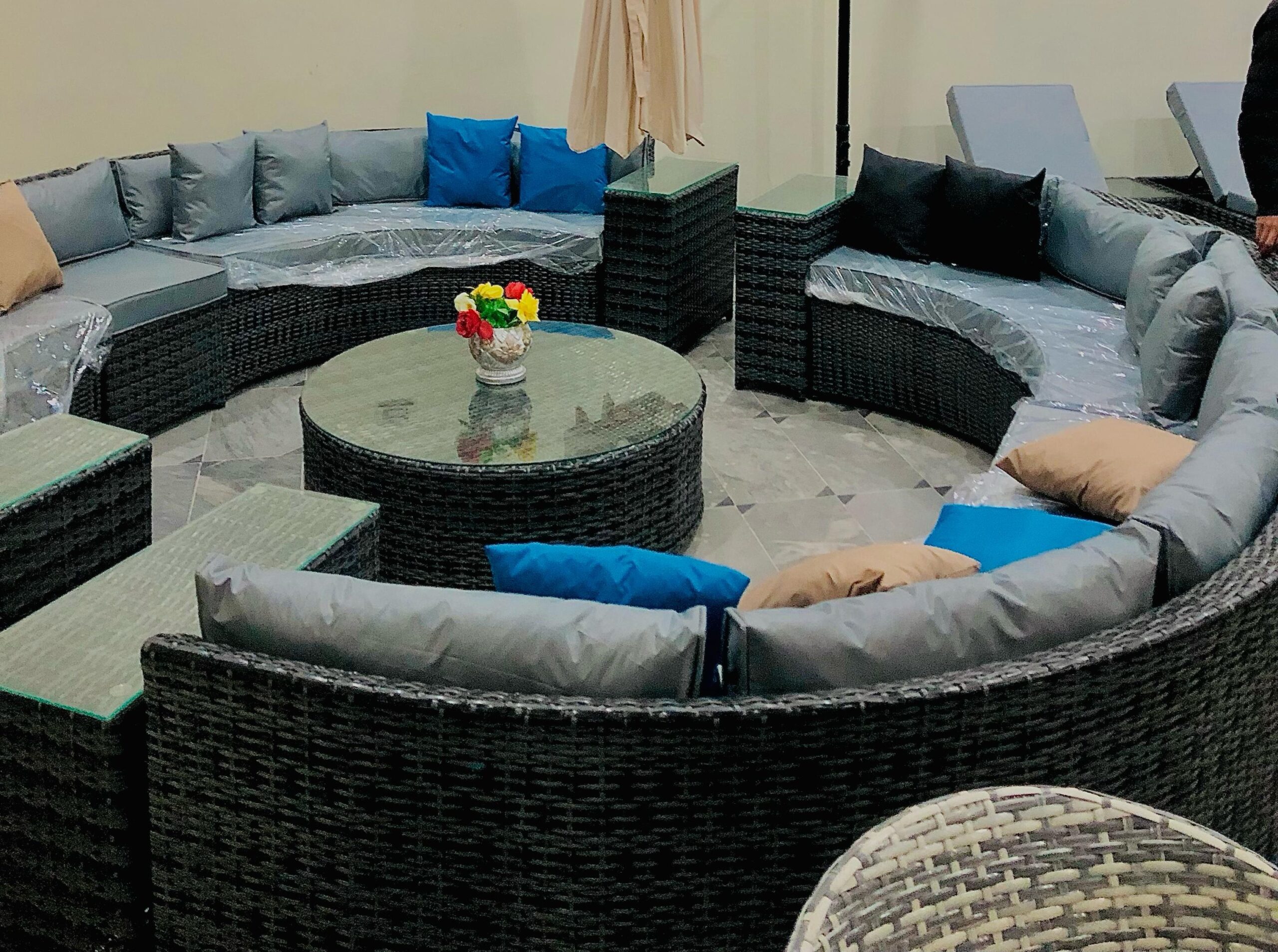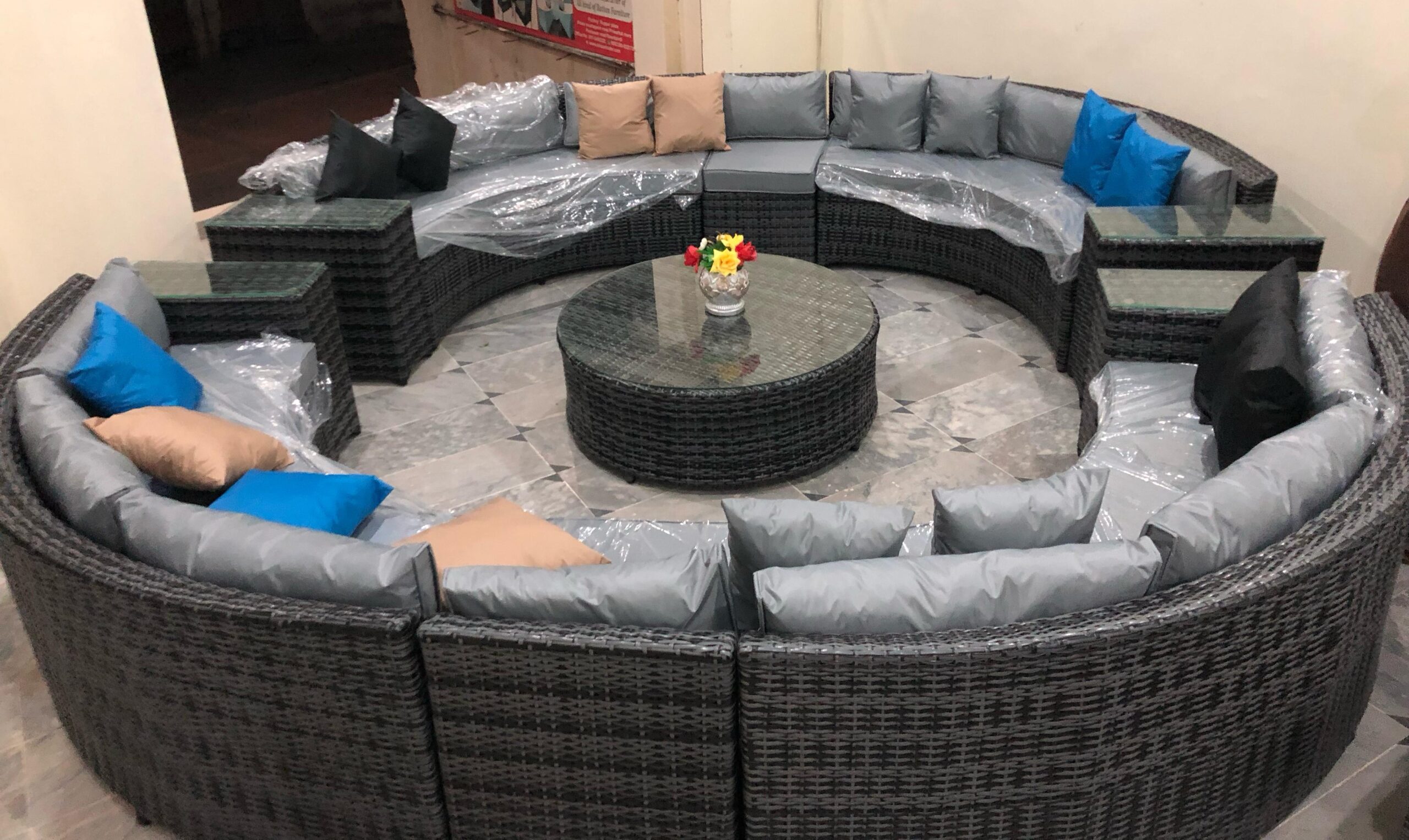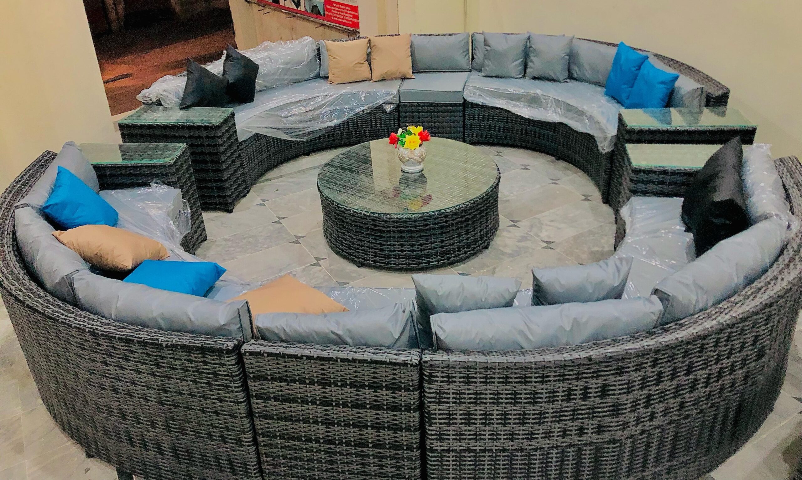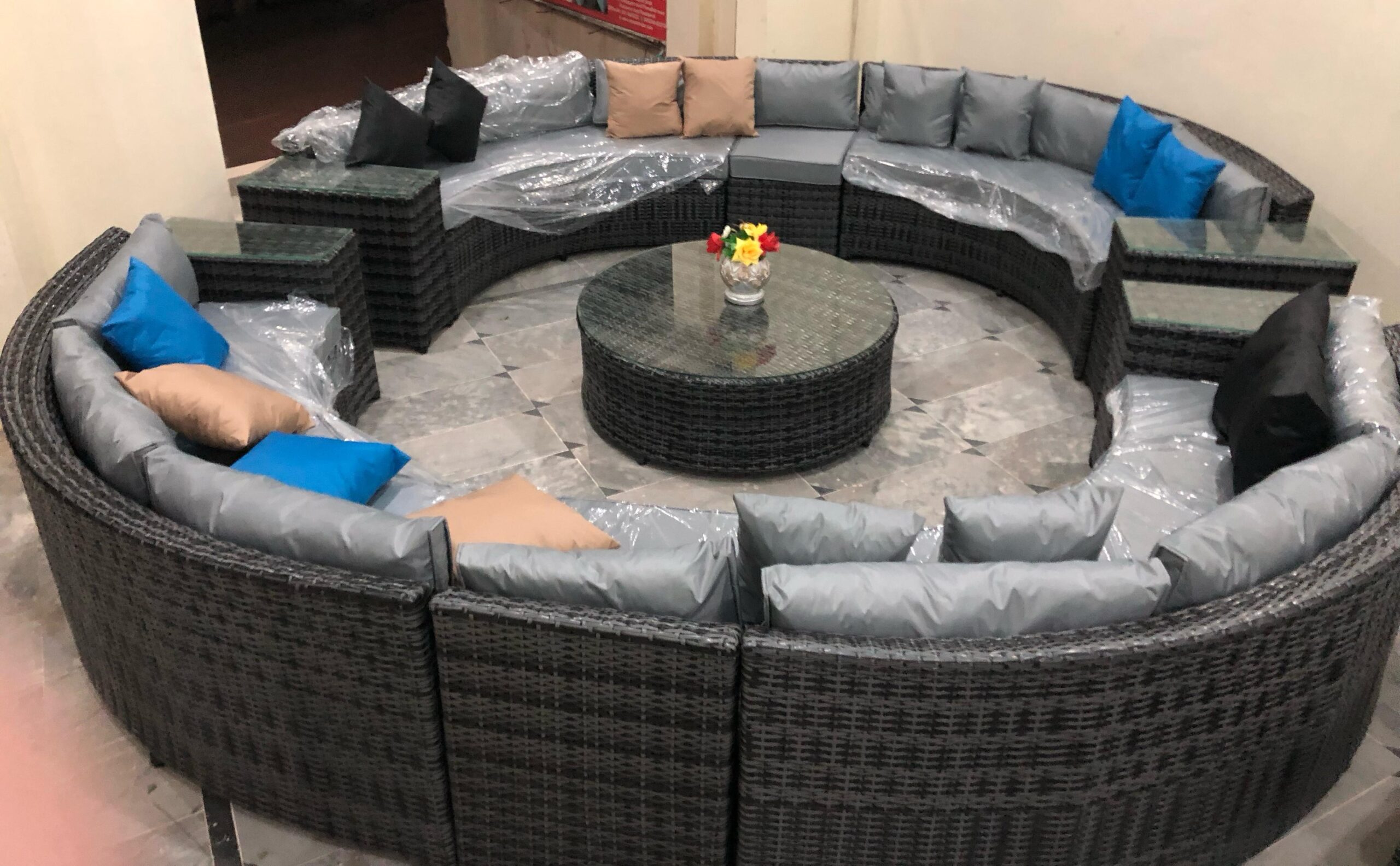Its totally counts 14seater round style sofa with premium quality parachute fabric cushions with 4 Pcs side table with 8mm glass with main table size 42×42″ with 8mm glass.
