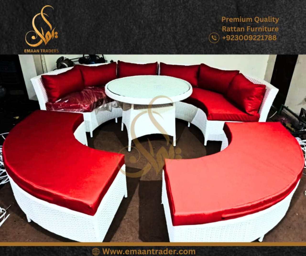 It’s has 6 seater round sofa with 6 seater ottomans( totally round 12 seater sofa) with premium quality parachute fabric cushions with round table size 42×42″ With 8mm glass.