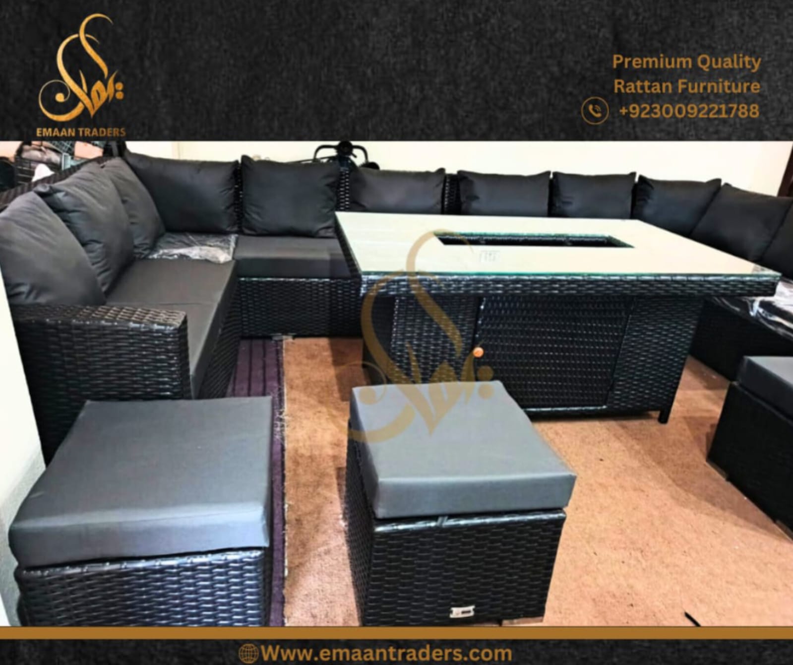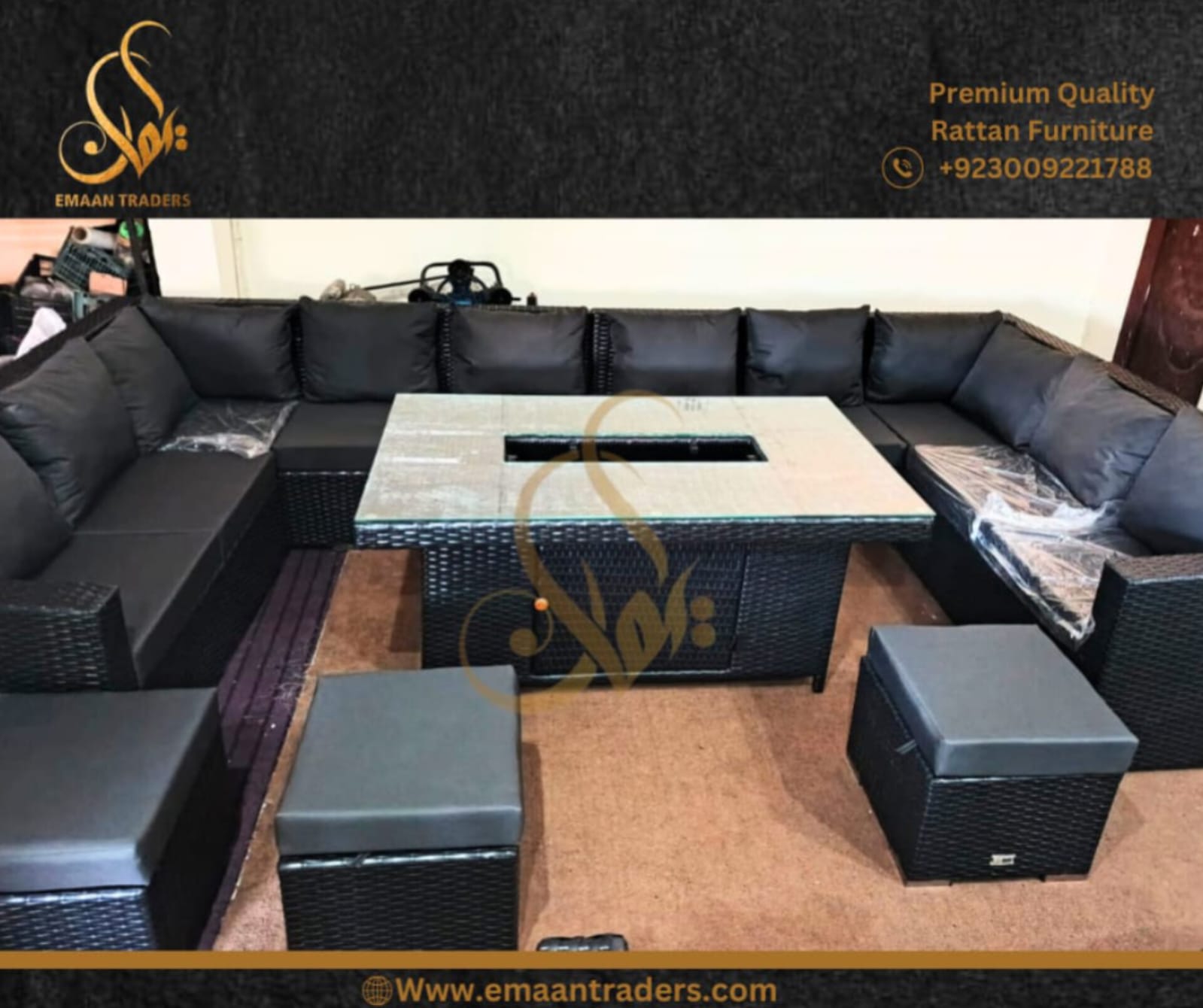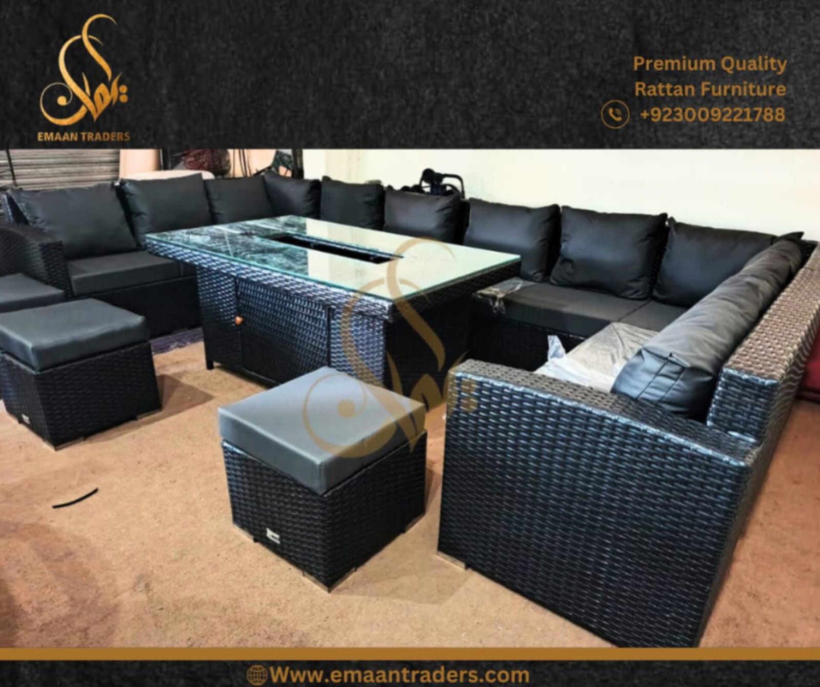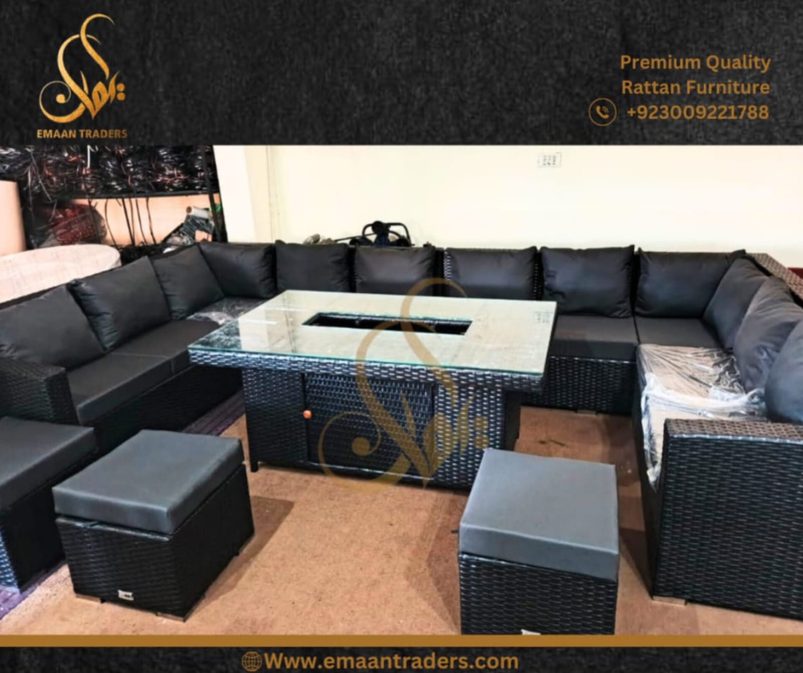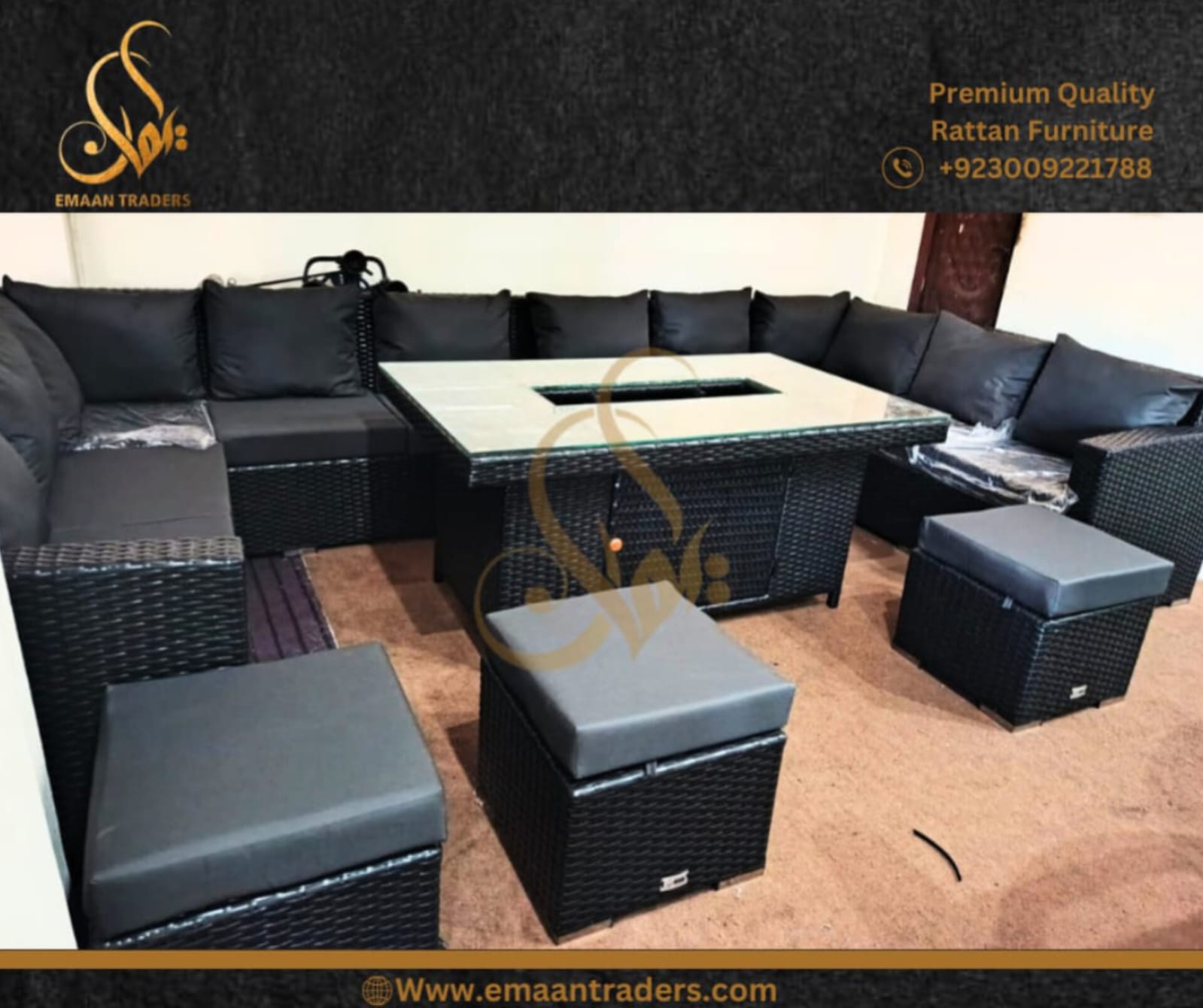 it’s u shaped totally count 10seater sofa with 3 PCs ottomans with premium quality parachute fabric cushions with centre table size 36×54″ With 8mm glass.